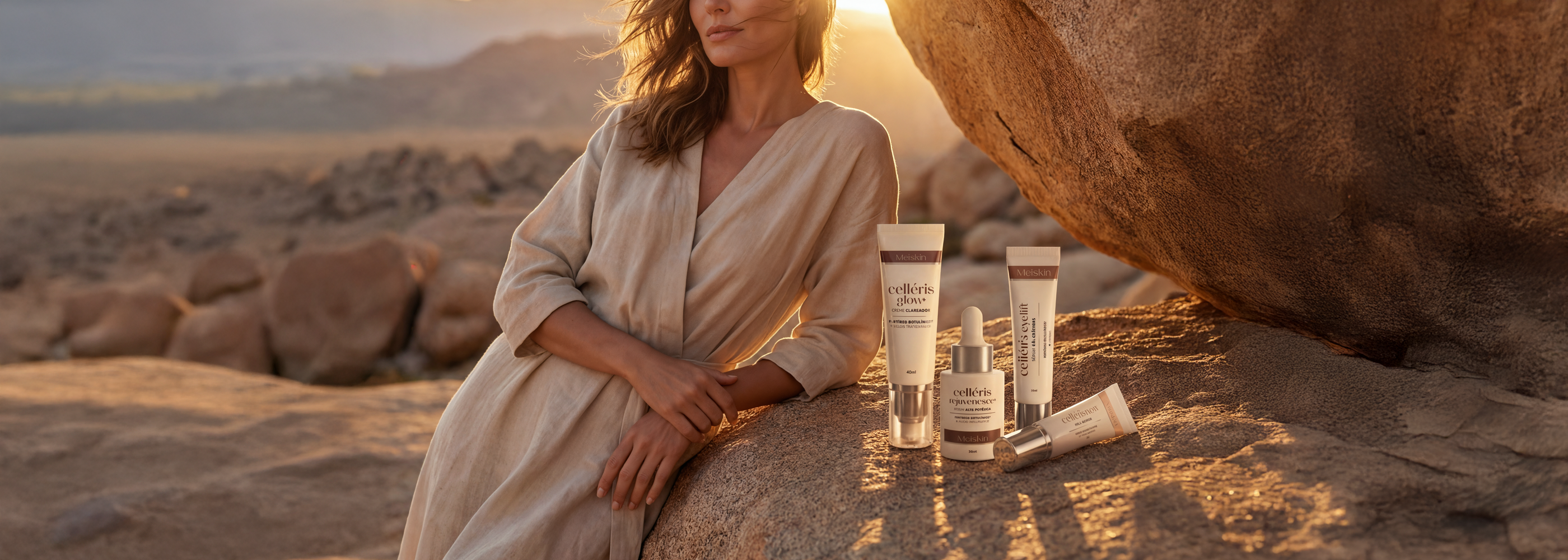 Clareador de manchas, gel anti idade, serúm anti-olheira. Meiskin contém soluções para para uma pele suavizada, equilibrada e luminosa.